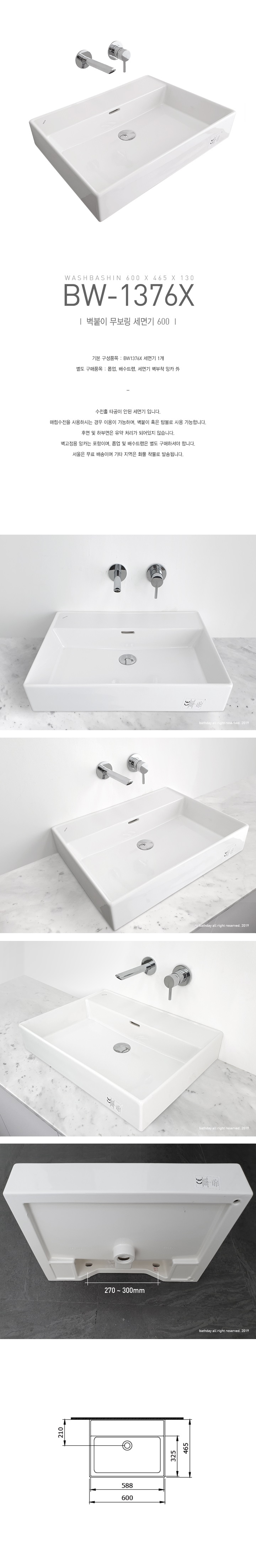 벽붙이 및 탑볼 사각 세면기 무보링 세라믹 세면대 465X600