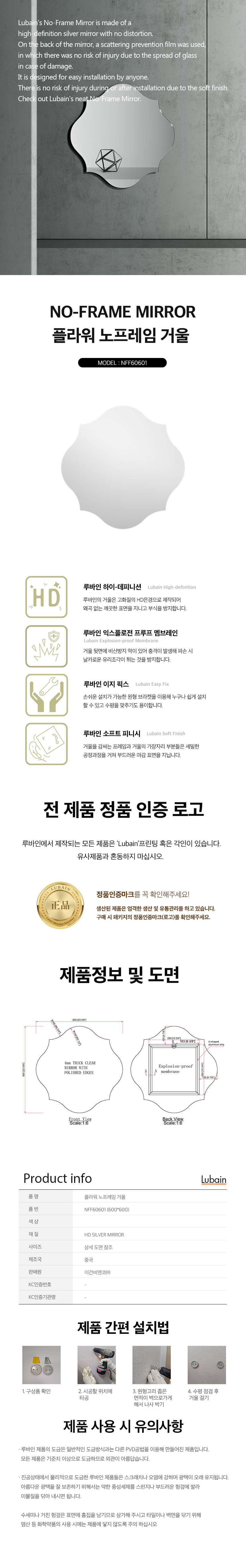 루바인 플라워 노프레임 거울 600X600 벽걸이 프레임리스 NFF60601