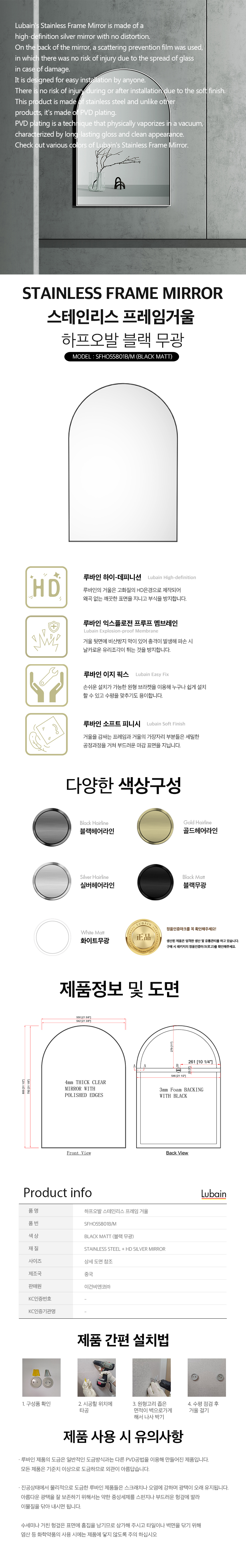 루바인 하프 오발 프레임 거울 블랙 무광 550X800 벽걸이 SFHO55801BM