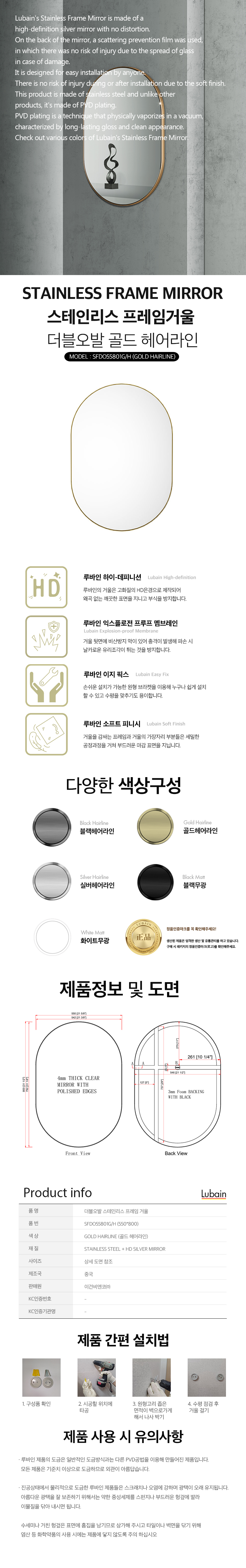 루바인 더블 오발 프레임 거울 골드 헤어라인 550X800 벽걸이 SFDO55801GH