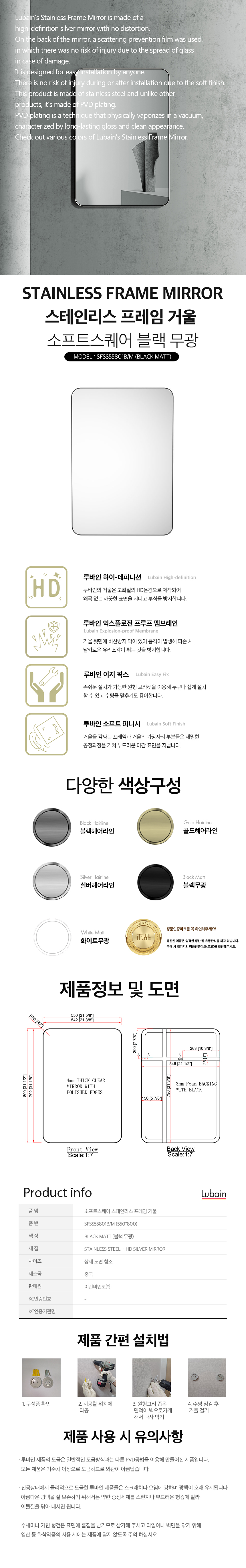루바인 소프트 스퀘어 프레임 거울 블랙 무광 550X800 벽걸이 SFSS55801BM