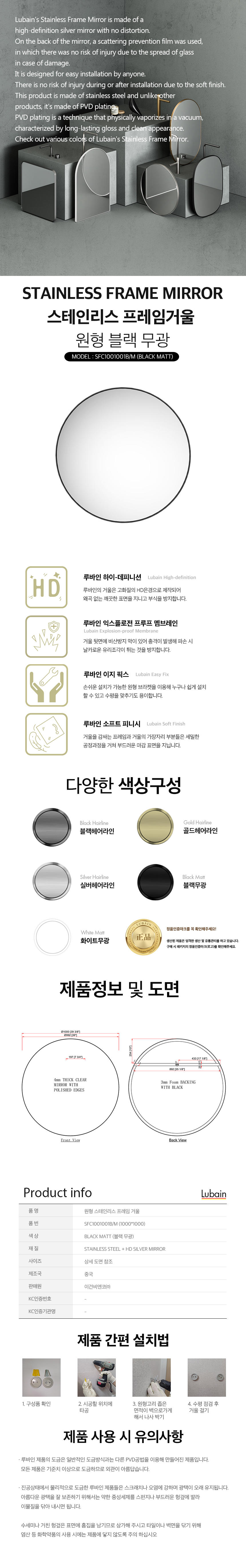 루바인 원형 프레임 거울 블랙 무광 1000X1000 벽걸이 SFC1001001BM