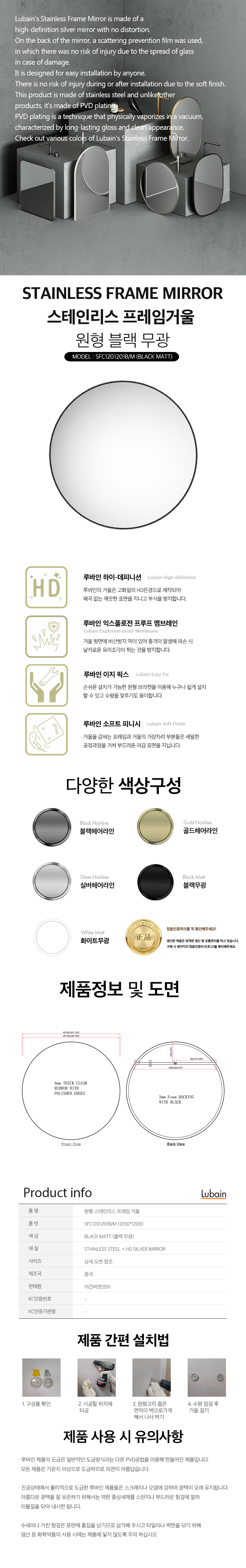 루바인 원형 프레임 거울 블랙 무광 1200X1200 벽걸이 SFC1201201BM