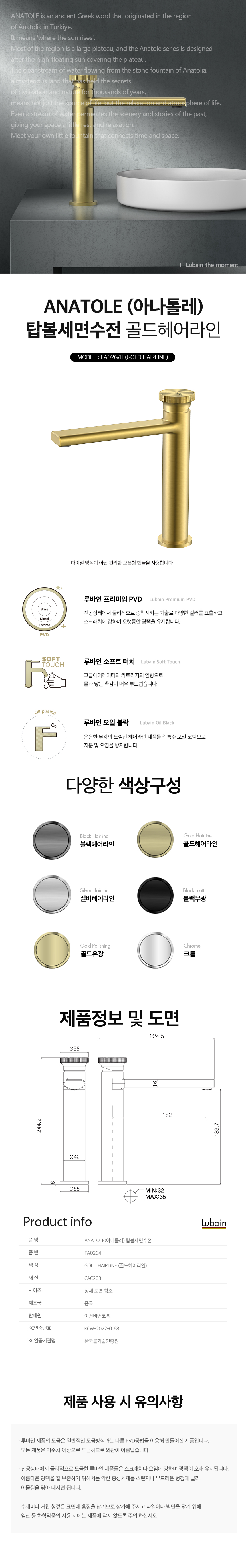루바인 아나톨레 세미 탑볼 원홀 세면수전 골드헤어라인 FA02GH